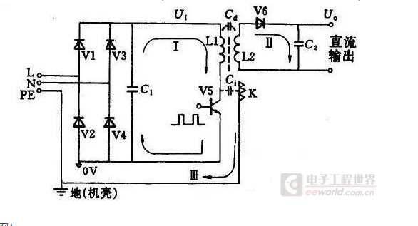 開關管由導通切換為關斷狀態時,脈沖變壓器分布電感儲存的能量,將與C1產生振蕩,導致開關管C、E之間的電壓迅速上升達500V左右,形成浪涌電壓。并產生按開關頻率工作的脈沖串電流,經集電極和散熱器之間的分布電容Ci及變壓器初,次級之間的分布電容Cd返回AC線形成共模騷擾電流。
